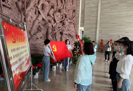 在莊嚴(yán)的紀(jì)念館序廳革命先輩浮雕前,全體黨員干部面對(duì)鮮紅的黨旗重溫了入黨誓詞。